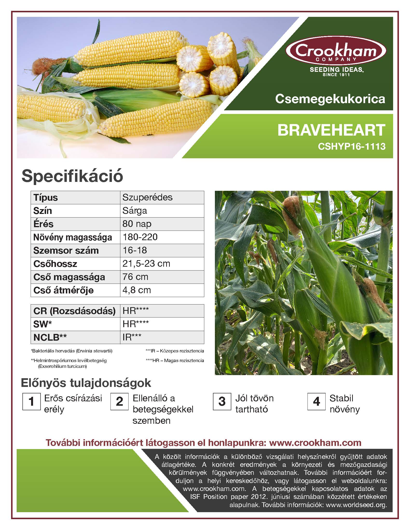 Classification Genotype SH2 Color Yellow Statistics Days to Maturity 75 Plant Height Medium Number of Rows 16-18 Ear Length 8.5-9", 21.5-23cm Ear Height Medium Ear Diameter 1.9" - 4.8cm Disease Ratings CR HR SW HR NCLB IR MDMV HR High Res Image PDF Flyer Braveheart demonstrates strong emergence and a flexible planting window. It has a strong disease package and large ear for the season and works well in many markets. Product Gallery